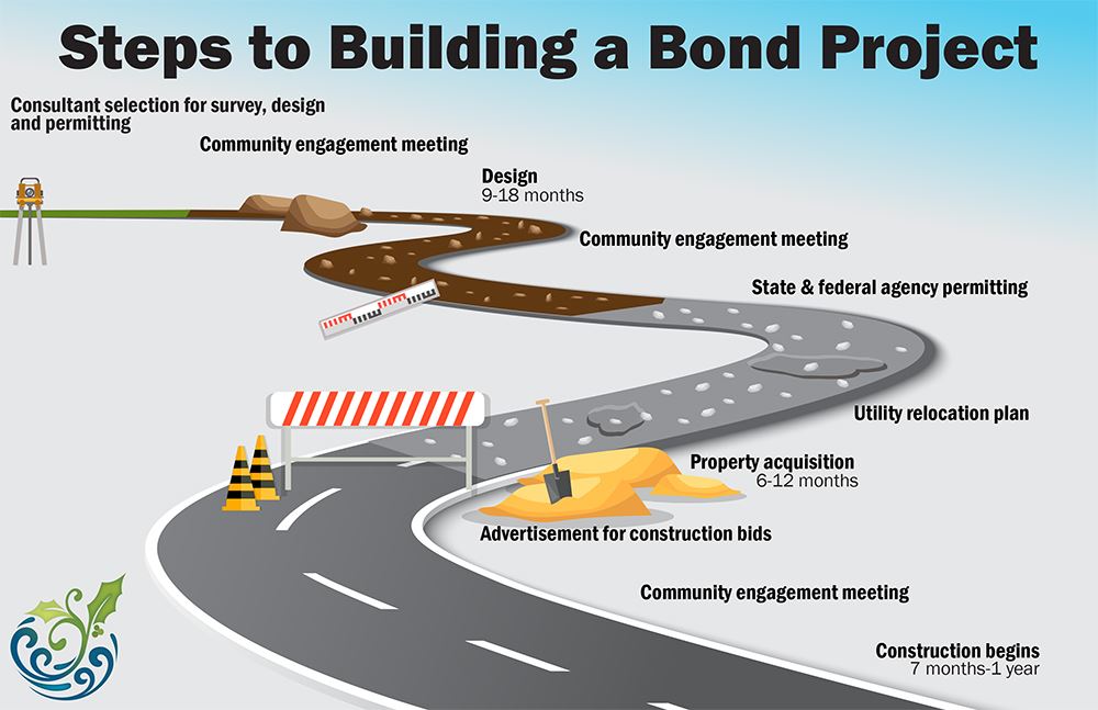Building and widening roads involves many steps along the way before construction. View the Steps to Building a Transportation Bond Project graphic.